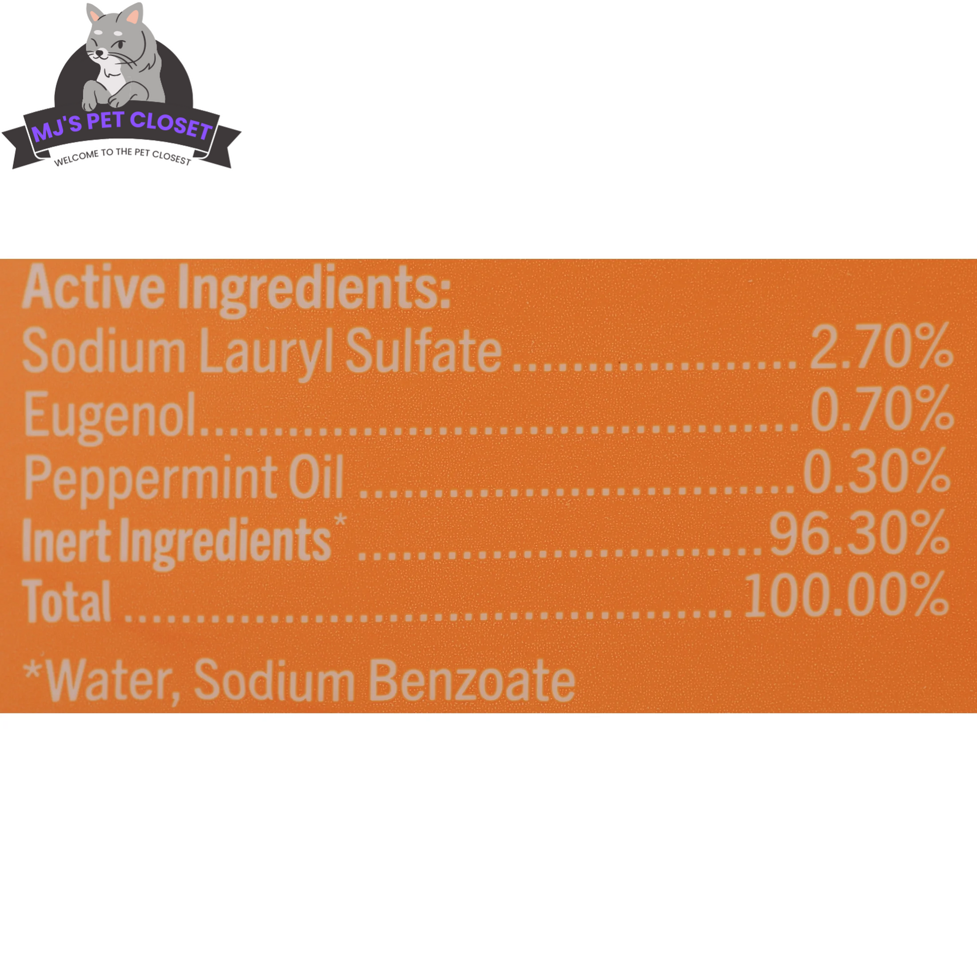 Active Ingredients: Peppermint Oil 0.30%, Eugenol (from Clove plants) 0.70%, Sodium Lauryl Sulfate (plant-derived) 2.70%, Inert Ingredients 96.30%, Water, Sodium Benzoate (preservative widely used in foods)./div>