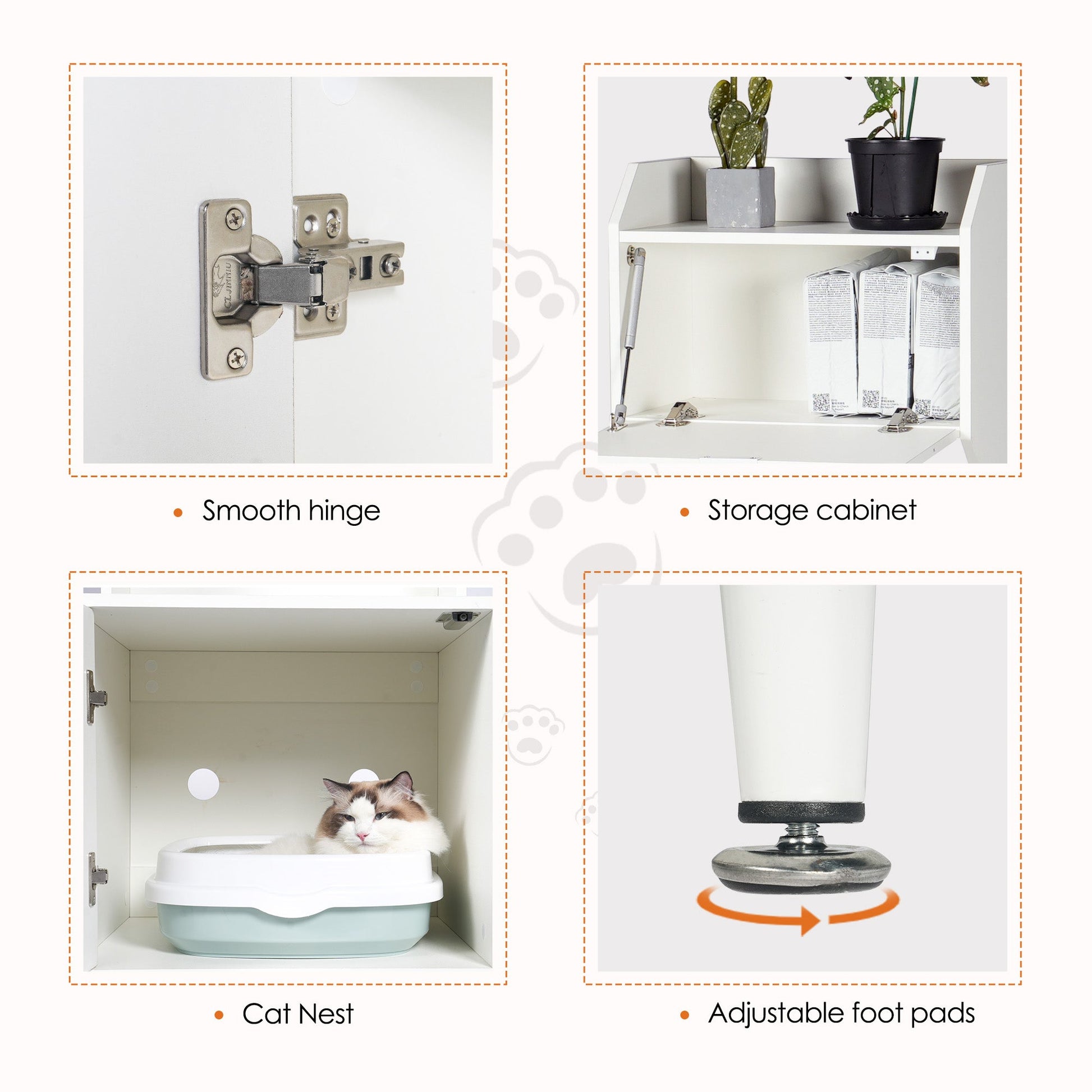 Large space: The upper level has storage shelves where you can put your potted plants, vases, and lockers where you can place cat toys under the flip door. The lower level is the cat litter box, which is used to place the cat litter box, avoid the cat litter scattered around, and beautify the indoor environment to make the home more tidy and beautiful!