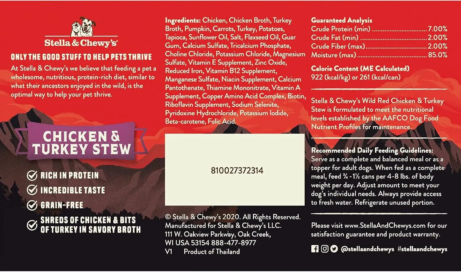 Transform mealtime for your picky eater with Stella & Chewy's Wild Red Wet Dog Food, crafted to satisfy the natural meat cravings your dog inherited from wild ancestors. Our premium Chicken & Turkey Stew delivers protein-rich nutrition with the savory taste they can't resist.